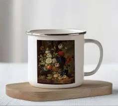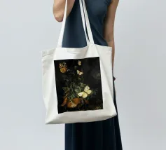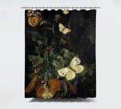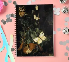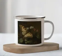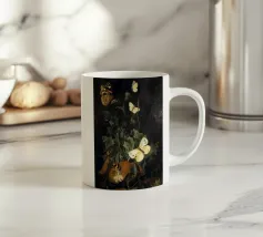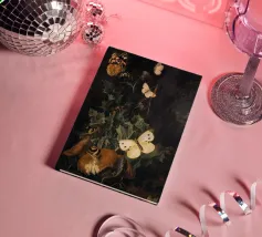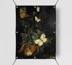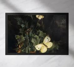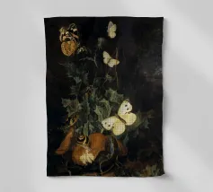 Farfalle e altri insetti sono raffigurati tra varie piante e funghi, creando una scena naturale ricca di dettagli. I colori sono scuri e tenui, per enfatizzare la consistenza e gli intricati dettagli di ali e foglie.