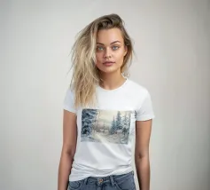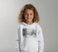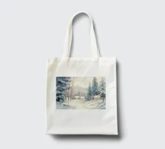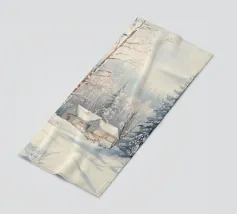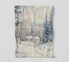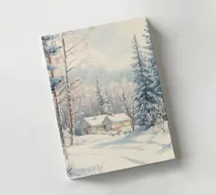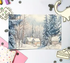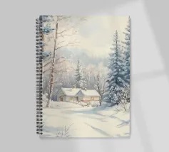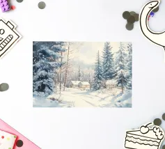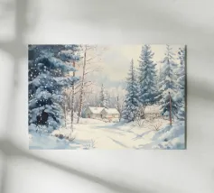 Sereno paesaggio invernale con alberi sempreverdi carichi di neve, un sentiero che conduce a due accoglienti baite con il fumo che sale dai loro camini e un nebbioso orizzonte montano.