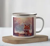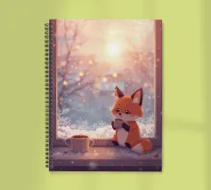 Voxy siede accanto a una finestra gelata sorseggiando una bevanda calda mentre fuori cadono fiocchi di neve. Un'accogliente atmosfera invernale per gli amanti delle illustrazioni morbide e sognanti.