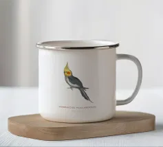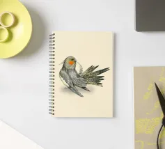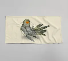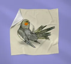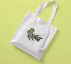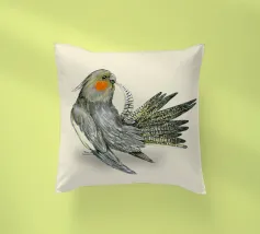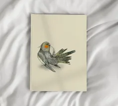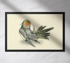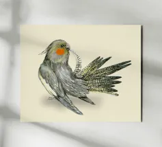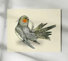 Disegno con pennarelli e penne ad acquerello di un cacatua che si prepara le penne della coda. Si tratta di una femmina. Tiene la piuma esterna della coda nel becco e questa piuma forma una bella curva. Il resto della coda è disteso a ventaglio. L'uccello è per lo più grigio con riflessi gialli.