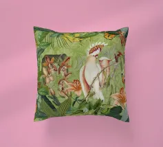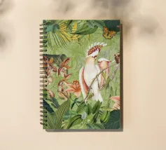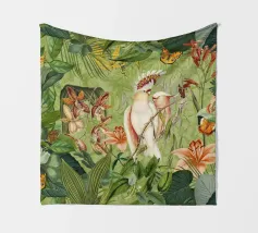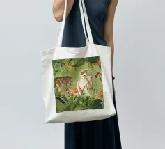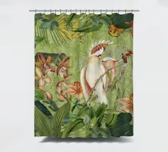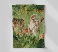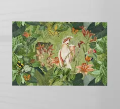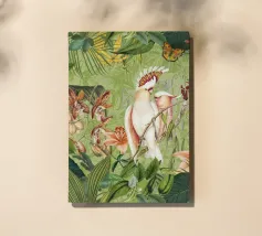 Vegetazione tropicale con cacatua esotici, fiori selvatici e fogliame nello stile dei libri botanici d'epoca, questa opera d'arte cattura il fascino della natura e dell'avventura. Ideale per chi desidera aggiungere un tocco esotico al proprio stile di vita, questo disegno evoca lo spirito di esplorazione e la bellezza dei tropici.