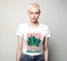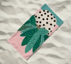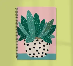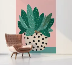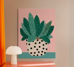 Illustrazione di un cactus verde vibrante in un grazioso vaso bianco a pois neri. Lo sfondo rosa tenue rende questo pezzo d'arte botanica moderna carino, trendy e giocoso.