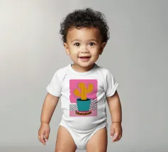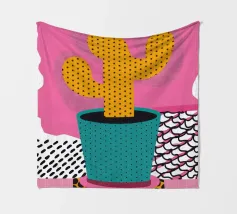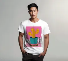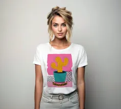 Un'illustrazione divertente e stravagante presenta un cactus rosa che indossa un piccolo cappello giallo, creando un personaggio affascinante e stravagante pieno di personalità.