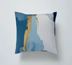 Alti piani dorati e blu scendono in una simmetria astratta su uno spazio fresco e minimale.