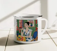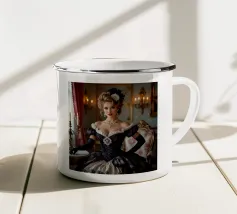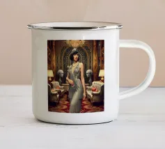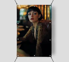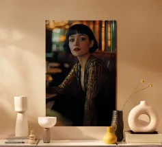 Catturate l'eleganza senza tempo dell'epoca Art Déco con questo splendido ritratto. Un'affascinante donna, con un classico carré nero e suggestive labbra rosse, mantiene uno sguardo sicuro dalla sua poltrona in un sontuoso caffè dalle luci soffuse. Le ricche tonalità verde acqua e oro creano un'atmosfera lussuosa e suggestiva, perfetta per aggiungere un tocco di raffinatezza e narrazione vintage a un salotto, a una zona pranzo o a una camera da letto.