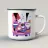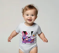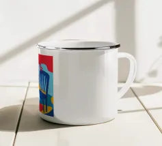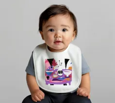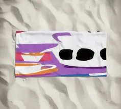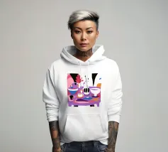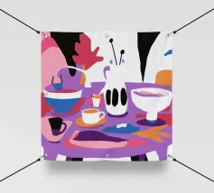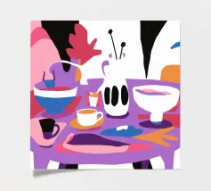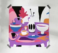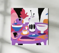 Una moderna natura morta di ispirazione cubista di un set da caffè o da tè su un tavolo viola. Le forme decostruite e l'audace tavolozza di colori creano un'interpretazione dinamica e artistica di un rituale quotidiano.