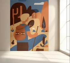 Una composizione di natura morta con elementi per la preparazione del caffè, una tazza e piante del deserto come cactus, sullo sfondo di un paesaggio desertico stilizzato con forme astratte. L'atmosfera è calma e calda.