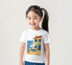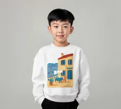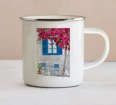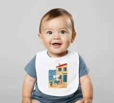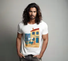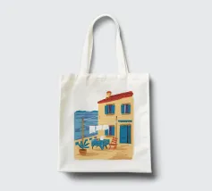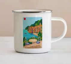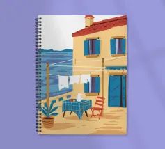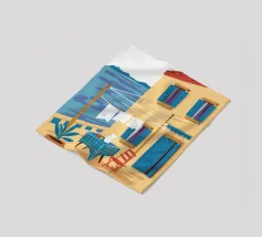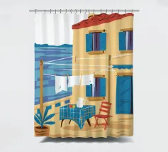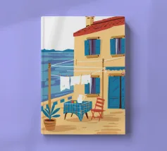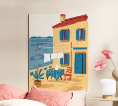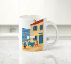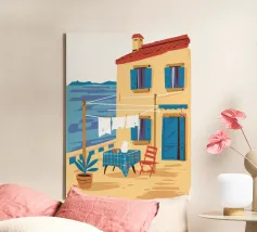 Un'affascinante illustrazione di un caffè sul mare con tavolo e sedie su un balcone che si affaccia sull'acqua. L'edificio giallo e l'atmosfera solare creano una scena di vacanza calda, invitante e idilliaca.