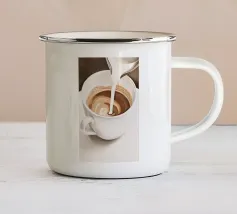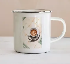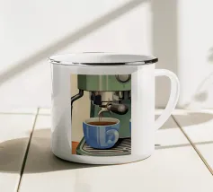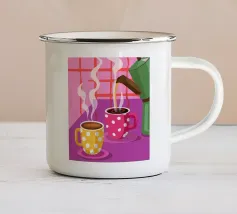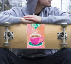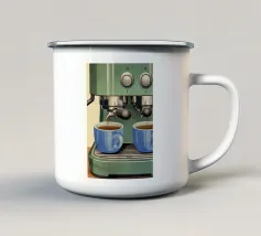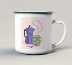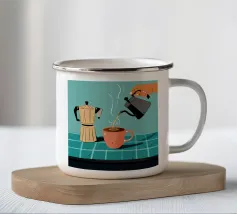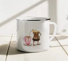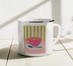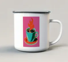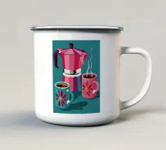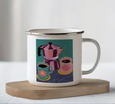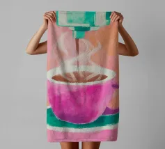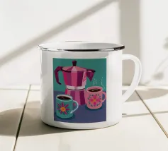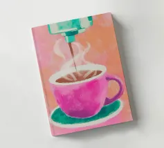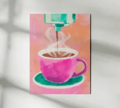 Una vivace pittura acrilica in rosa, turchese e arancione raffigura eleganti tazze da caffè che celebrano la passione per il caffè e l'arte del barista. Questa illustrazione minimalista porta colore e creatività in ogni cucina.