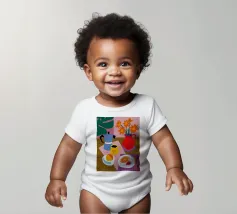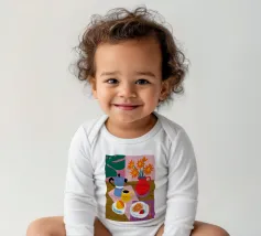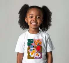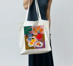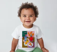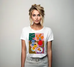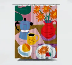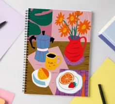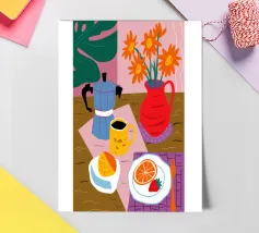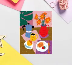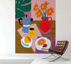 Vista dall'alto di un tavolo per la colazione con caffettiera, tazze, arance a fette e fiori, resa in uno stile grafico e audace con colori caldi e invitanti.