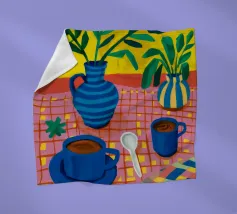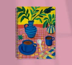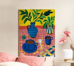 Una natura morta con un vaso a scacchi blu con fiori gialli, una tazza di caffè e un cucchiaio su una tovaglia rosa, che crea una scena mattutina allegra e invitante.