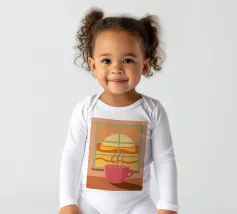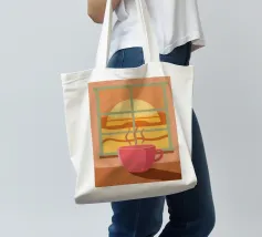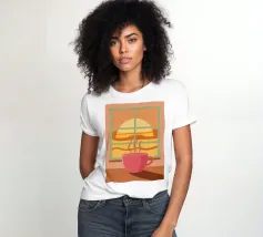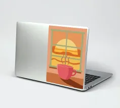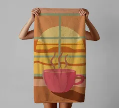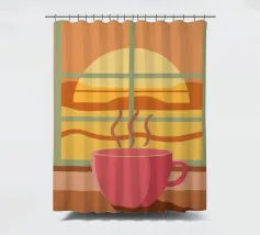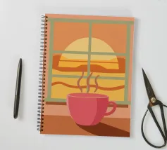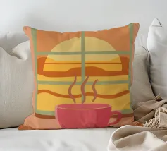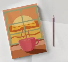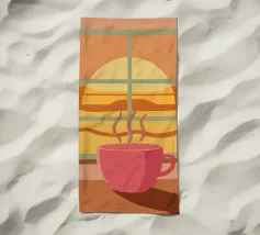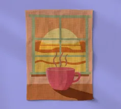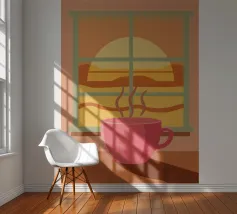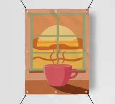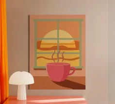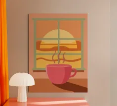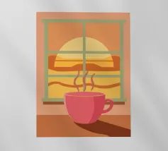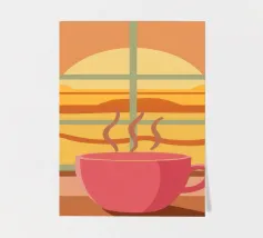 Un'illustrazione semplice e confortante di una tazza rosa di caffè o tè fumante, appoggiata a una finestra con vista sul sole che sorge. La scena cattura perfettamente il calore e la speranza di un nuovo mattino.