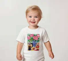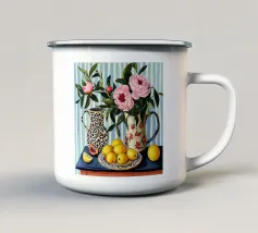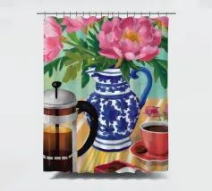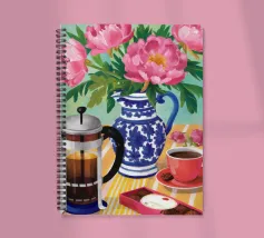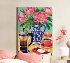 Un'elegante natura morta con una caffettiera a pressione, una tazza di caffè fresco, una tavoletta di cioccolato e un bellissimo bouquet di peonie rosa in un vaso a cineserie blu e bianco. La scena è una rappresentazione sofisticata e lussuosa di una perfetta pausa caffè.