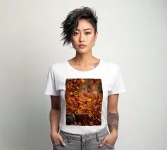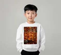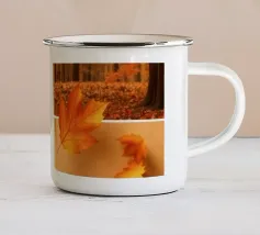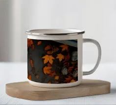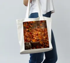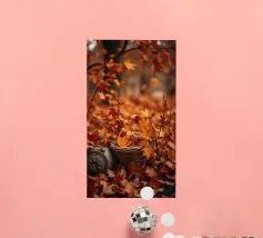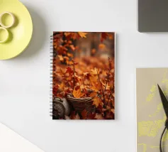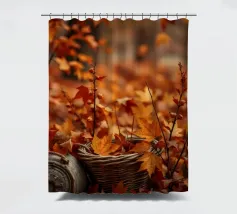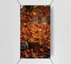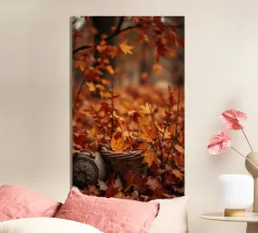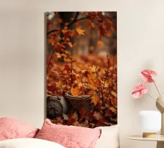 Vibranti foglie arancioni e rosse ricoprono il terreno in un sereno scenario autunnale, con un cesto intrecciato parzialmente riempito di foglie annidato tra di esse, creando un'atmosfera accogliente.
