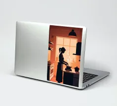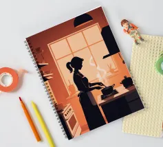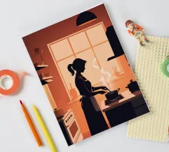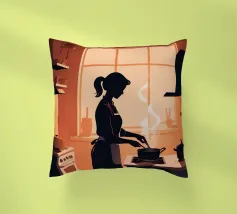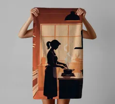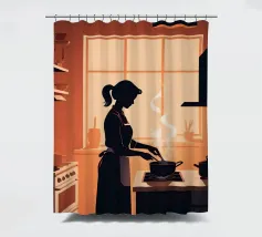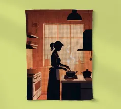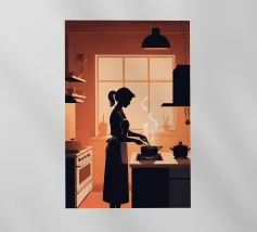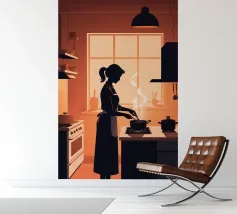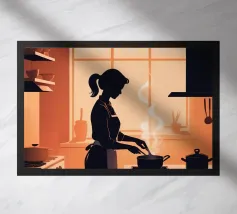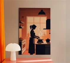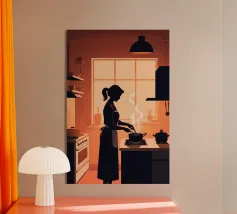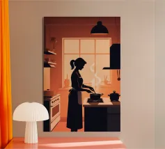 Un'accogliente silhouette di una donna che prepara un pasto caldo in una cucina dalle luci soffuse. Il delicato bagliore, il vapore e i toni nostalgici creano un'atmosfera accogliente che aggiunge calore a qualsiasi zona pranzo o spazio abitativo.