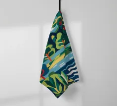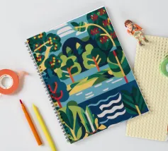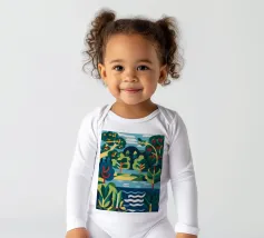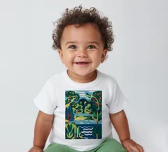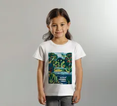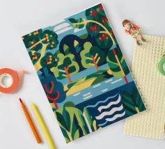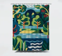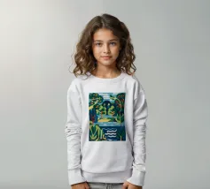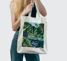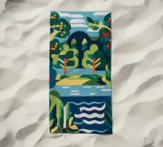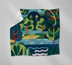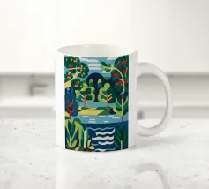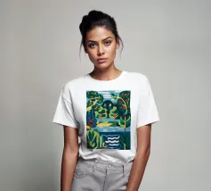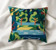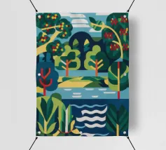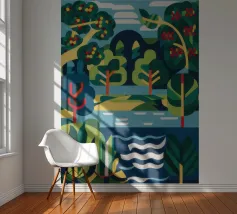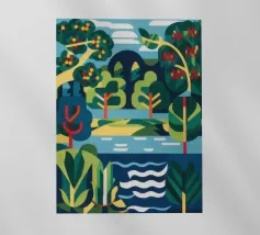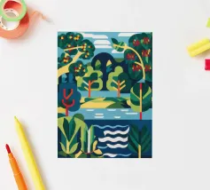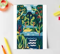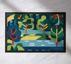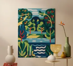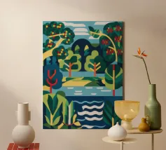 Un dipinto paesaggistico espressivo e vibrante con un fiume che scorre attraverso una foresta colorata e astratta. Lo stile ricco e pittorico e il caleidoscopio di colori creano un'interpretazione dinamica e gioiosa della natura.