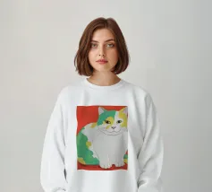 Ritratto stilizzato di un gatto calico con distinte macchie verdi e arancioni sulla sua pelliccia bianca. Il gatto ha un'espressione gentile ed è collocato su uno sfondo rosso deciso, che mette in risalto il suo manto unico.
