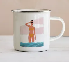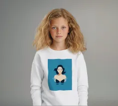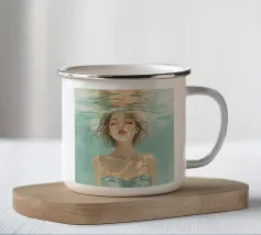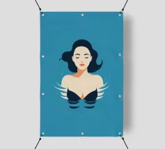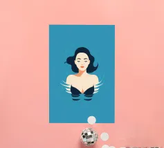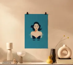 Un'illustrazione tranquilla di una donna che galleggia nell'acqua con gli occhi chiusi. Le forme minimali e le serene tonalità del blu evocano pace, equilibrio e un senso di liberazione: ideale per bagni o spazi di meditazione.