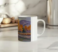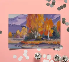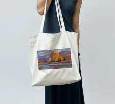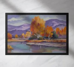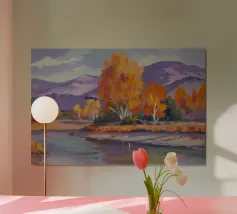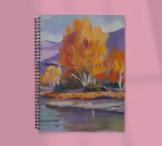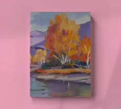 Un sereno paesaggio autunnale con un gruppo di alberi dal fogliame giallo-oro brillante sulla riva di un lago o di un fiume calmo, i cui colori e forme vibranti si riflettono magnificamente nell'acqua ferma sotto un cielo morbido e vaporoso.