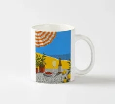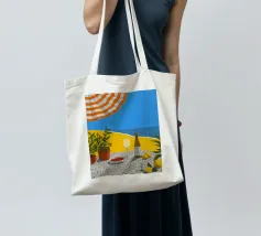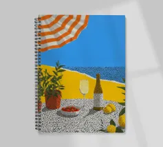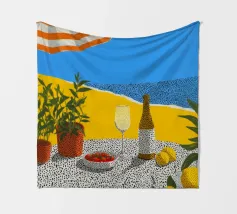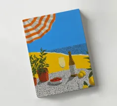 Un vivace motivo estivo dai colori vivaci celebra la perfetta vacanza in spiaggia: bottiglie di vino, pomodori freschi e limoni, completati da bicchieri da vino, il tutto sotto un ombrellone a righe. I punti e le macchie nere aggiungono un tocco giocoso all'opera d'arte e catturano l'atmosfera mediterranea rilassata di una spiaggia sabbiosa. Ideale per qualsiasi ambiente che voglia aggiungere un tocco di estate e di vacanza!