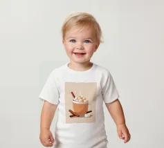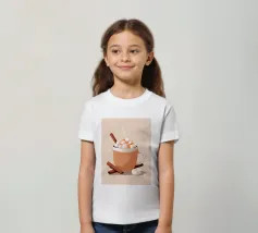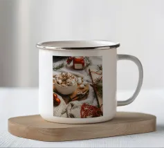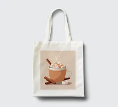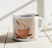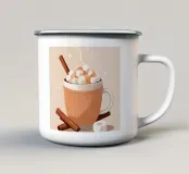 Un'accogliente illustrazione piatta di una tazza avvolta in un manicotto lavorato a maglia, sormontata da marshmallow e bastoncini di cannella. Un pezzo perfetto per portare calore e dolcezza in qualsiasi angolo della cucina o del caffè.