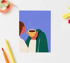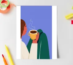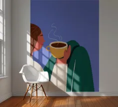 Primo piano di una persona con una felpa verde con cappuccio, che tiene in mano una tazza di caffè caldo e guarda pensierosa fuori da una finestra, catturando un momento di tranquilla e accogliente contemplazione.