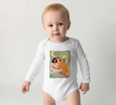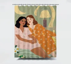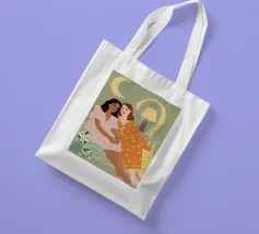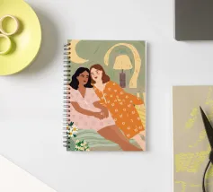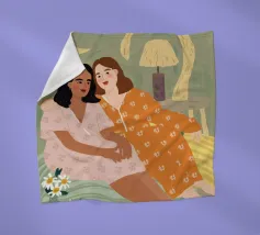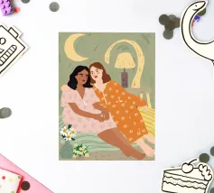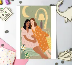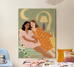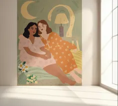 Il dipinto raffigura due persone sedute a stretto contatto, una che indossa un abito rosa e l'altra un abito arancione, con un accogliente sfondo interno.