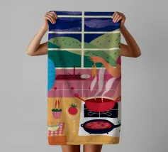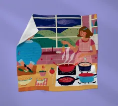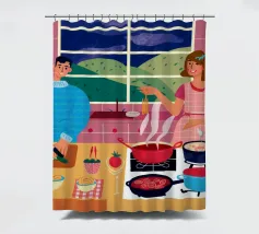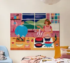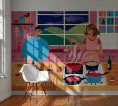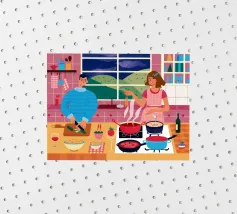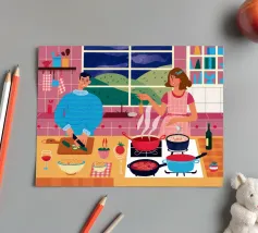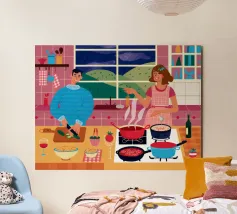 Un'accogliente scena di cucina in cui due figure sono impegnate a cucinare, circondate da pentole, padelle e ingredienti, illuminate da una luce calda che evoca un senso di familiarità e di attività condivisa.