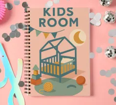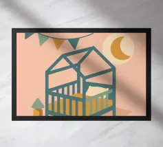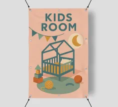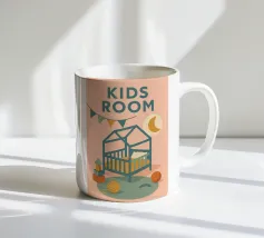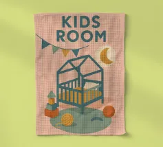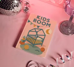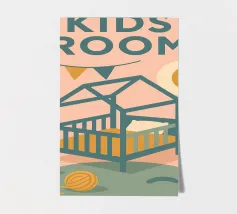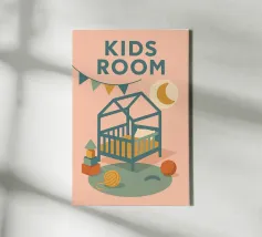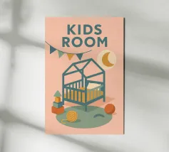 Immergetevi nel mondo tenero e rassicurante del poster "Kids Room". Una stanza per bambini dai toni pastello, che combina luce lunare, ghirlande e giocattoli colorati per un arredamento caldo e poetico.