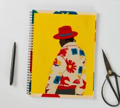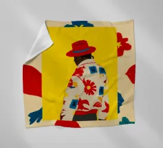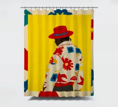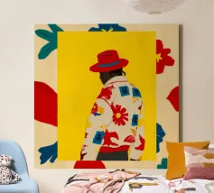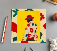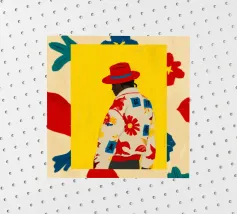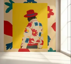 Un uomo con un cappello rosso e una camicia a fiori si trova di spalle su uno sfondo beige con petali sparsi.