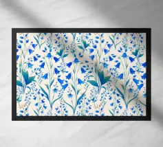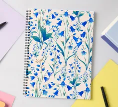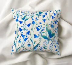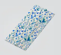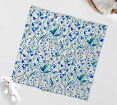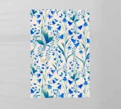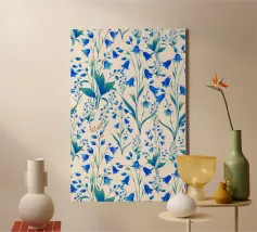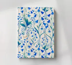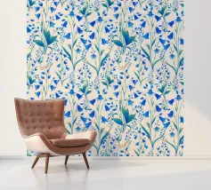 Bellissima stampa floreale con delicate campanule blu cobalto e foglie verdi, su sfondo color crema.