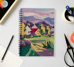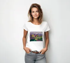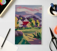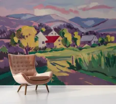 Un vivace paesaggio rurale che mostra un'affascinante fattoria dai tetti rossi su una strada o un campo di colore viola, con dolci colline verdi e gialle che conducono a montagne lontane sotto un cielo soffice e sfumato di rosa.