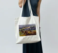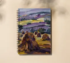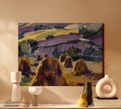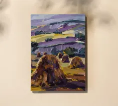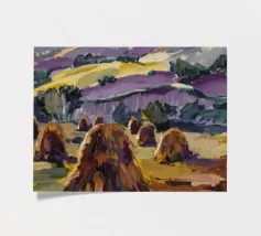 Un paesaggio rurale che ritrae campi coltivati con pagliai o fasci di fieno sotto un cielo morbido e ampio. I toni terrosi e l'atmosfera tranquilla evocano la calma e la soddisfazione della fine della stagione del raccolto.