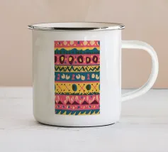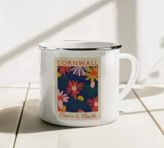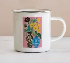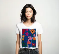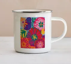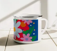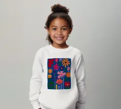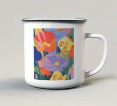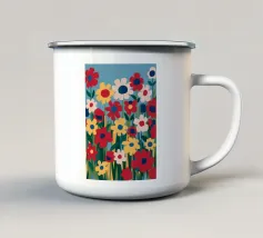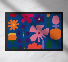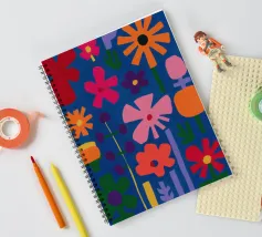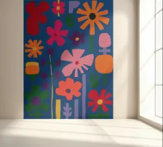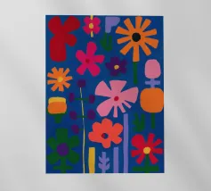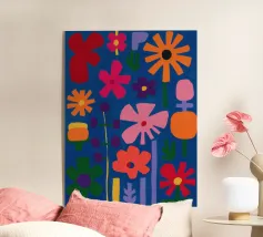 Un affascinante motivo di fiori semplici e stilizzati in una tavolozza di colori retrò, arancione, blu e rosa, su steli dritti, che creano un campo nostalgico e allegro.