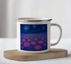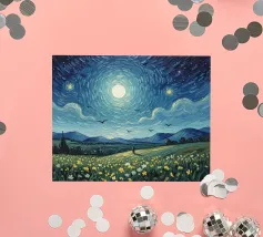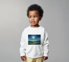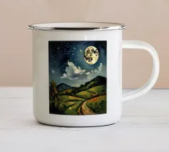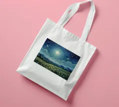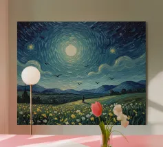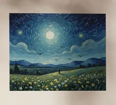 Immerso nella luce argentea, il paesaggio sembra tranquillo e surreale: un luogo dove il tempo rallenta e il mondo respira dolcemente. La luna aleggia come un guardiano vigile, illuminando erbe, ombre e immaginazione. Quest'opera invita alla riflessione, alla meraviglia e a un senso di pacifica solitudine nella vastità della notte.