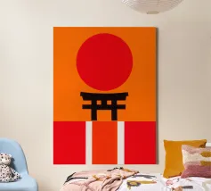 Un'iconica porta torii si staglia contro un sole rosso e incandescente: tranquillità spirituale in una forma minimalista: Questa composizione minimalista distilla l'estetica giapponese nella sua essenza. I toni caldi dell'arancio e del rosso si fondono per creare un'atmosfera meditativa, mentre la silhouette nera del cancello shintoista ha una presenza grafica. Ispirato alle xilografie giapponesi e al minimalismo occidentale, il risultato è un simbolo senza tempo di meditazione e trasformazione. La geometria austera e la palette di colori vibranti creano una forza contemplativa, perfetta per gli spazi caratterizzati da chiarezza e spiritualità.