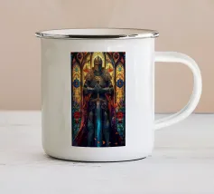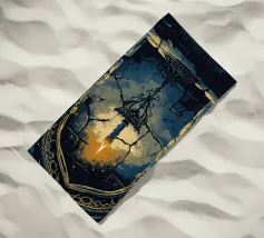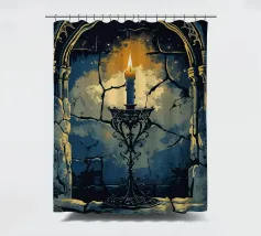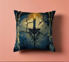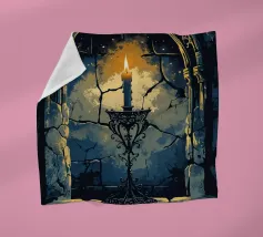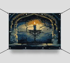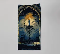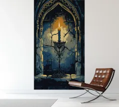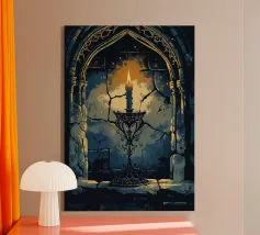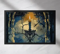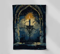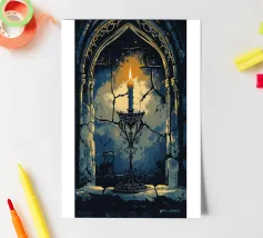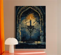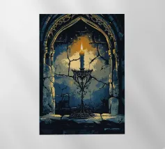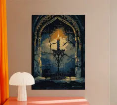 Un'opera d'arte d'atmosfera che raffigura una candela solitaria che arde su un candeliere in filigrana all'interno di un vecchio arco di pietra fatiscente. L'illuminazione soffusa e il contrasto tra luce e ombra creano un'atmosfera misteriosa, quasi medievale. Ideale per gli amanti del fantasy e dell'estetica gotica o come accento per ambienti dal sapore mistico.