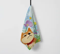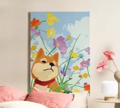 cane fiori nuvole cielo blu erba collare rosso campo giornata di sole primavera all'aperto natura fiori gialli fiori viola fiori arancioni steli verdi modello floreale animale domestico animale paesaggio colori vivaci
