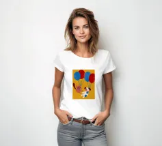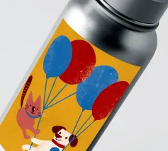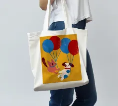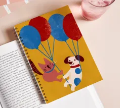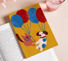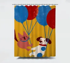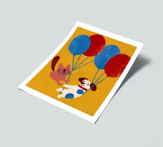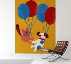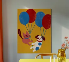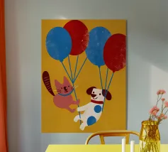 L'illustrazione "Balloon Dog and Cat" presenta un cane e un gatto che giocano insieme, creando un'atmosfera allegra e amichevole.