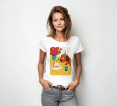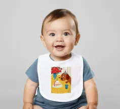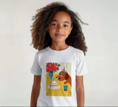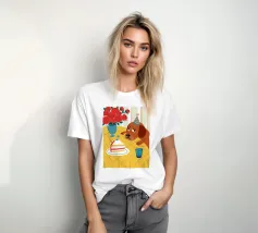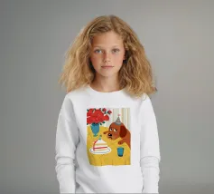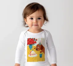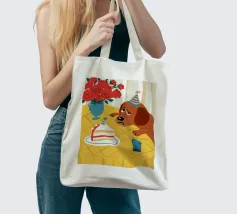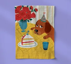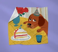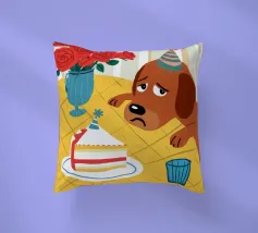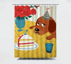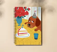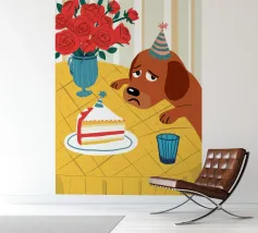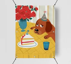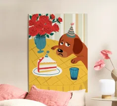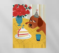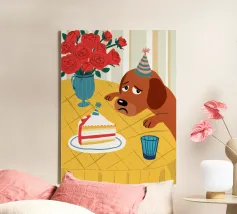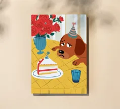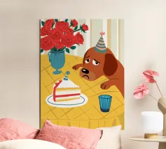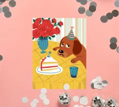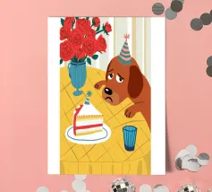 Illustrazione stravagante e leggermente malinconica di un cane dall'aspetto triste che indossa un cappello da festa, seduto davanti a una torta di compleanno con rose rosse sullo sfondo.
