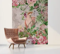 Questo collage vintage è ricco di colori tropicali e di fascino senza tempo. Al centro, una splendida coppia di cacatua rosa nei toni del rosa e del blush si erge orgogliosa, con i suoi petali esotici che creano un punto focale di grande effetto. Intorno, frutti tropicali e passiflore dai colori vivaci esaltano la scena lussureggiante e vivace. Lo sfondo è caratterizzato da una mappa sbiadita, che aggiunge un senso di nostalgia e avventura. La combinazione della bellezza della natura e degli elementi vintage crea una composizione dinamica ma tranquilla, che invita l'osservatore in un mondo di esplorazione e serenità tropicale.