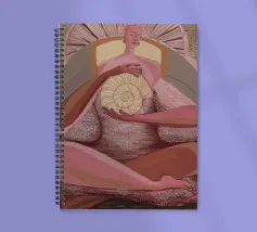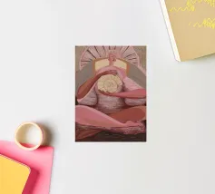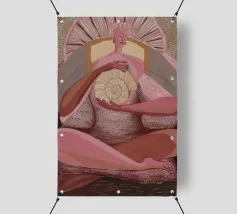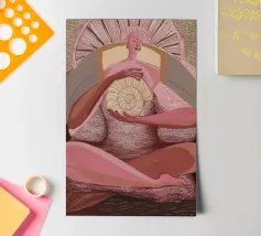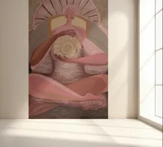 Una serena figura femminile regge un simbolo a spirale in una radiosa luce rosa, che emana potere sacro e calma interiore.