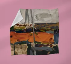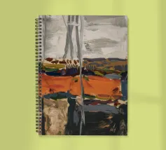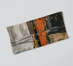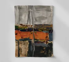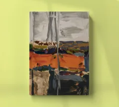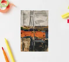 Un paesaggio astratto che raffigura strati profondi di canyon con bande orizzontali di rosso scuro, arancione, nero e grigio, che trasmettono un senso di profondità geologica e di terreno accidentato. Stile Bob Nugent / de Stael.