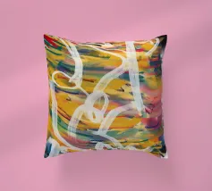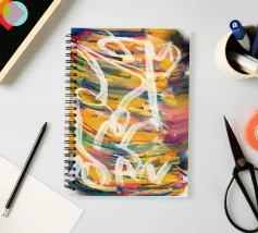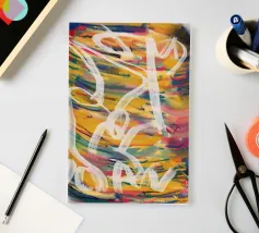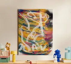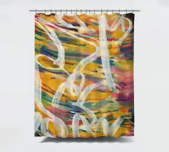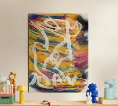 Pennellate vibranti in una miriade di colori creano una composizione dinamica e astratta. Le linee curve bianche danzano energicamente sullo sfondo colorato, suggerendo movimento e spontaneità.