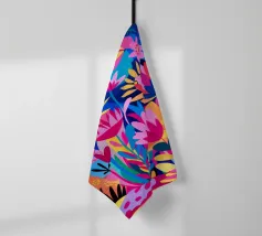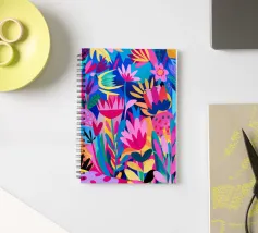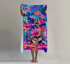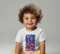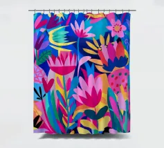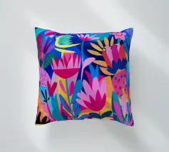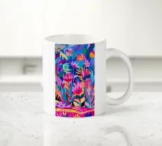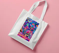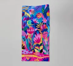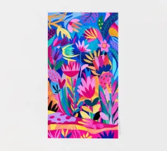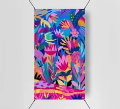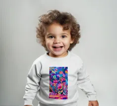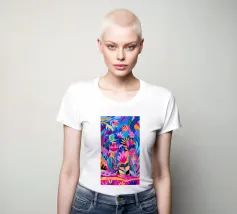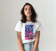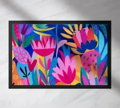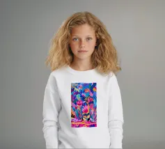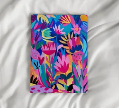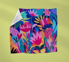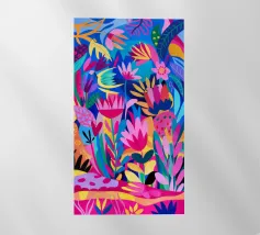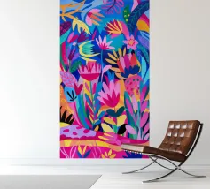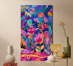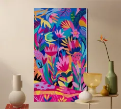 Un motivo astratto altamente energico e caotico di forme floreali e geometriche stilizzate in rosa, blu, gialli e arancioni vivaci, che trasmette un senso di fioritura selvaggia e gioiosa dell'era digitale.