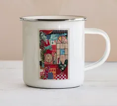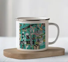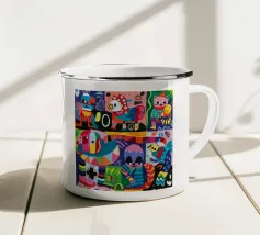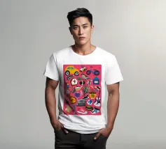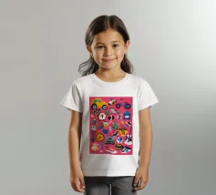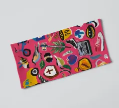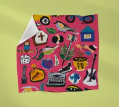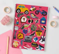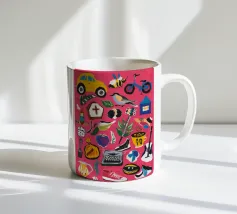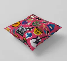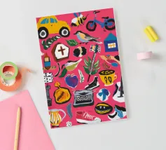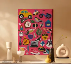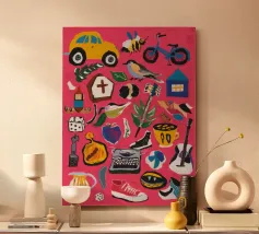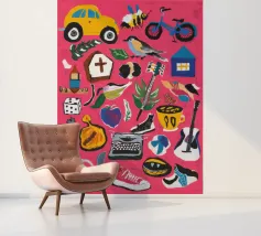 Uno sfondo rosa acceso riempito di vari oggetti giocosi ed eclettici, tra cui una macchinina, una chitarra, una scarpa, un orologio e altri oggetti vari.