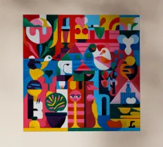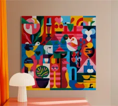 In "Caos geometrico", forme dinamiche e tinte vivaci creano una composizione coinvolgente ed energica. Questo dipinto esplora la bellezza del disordine e l'eccitazione della spontaneità artistica.