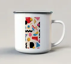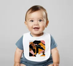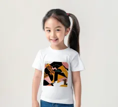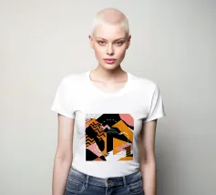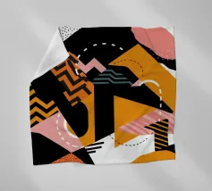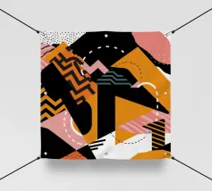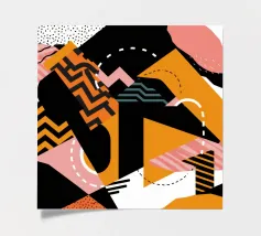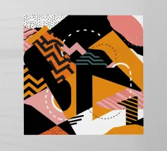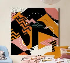 Un'opera astratta ad alta energia, piena di linee nere a zig zag, forme geometriche e motivi espressivi. La composizione, che utilizza una tavolozza di arancione, beige e nero, è dinamica, audace e piena di movimento.