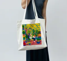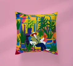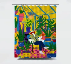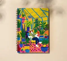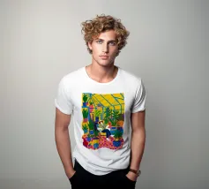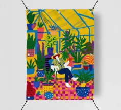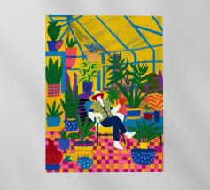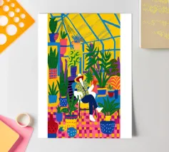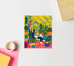 Un'illustrazione vivace e allegra di una serra piena di piante e fiori colorati. Una figura con la testa di gallo si prende cura delle piante, aggiungendo un tocco surreale e giocoso alla scena lussureggiante e inondata di sole.