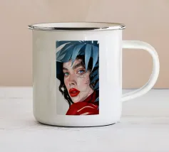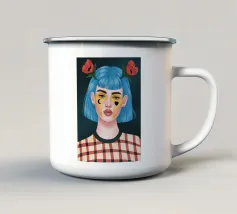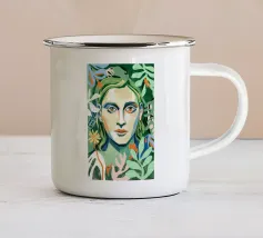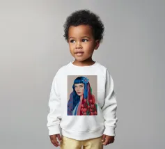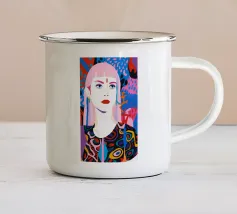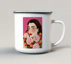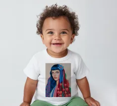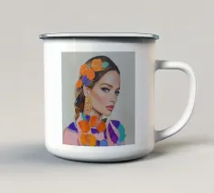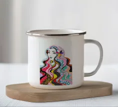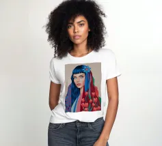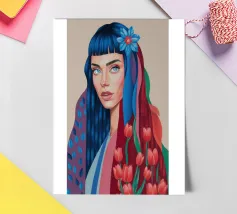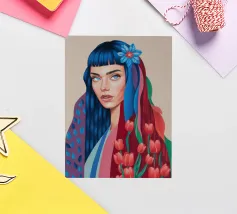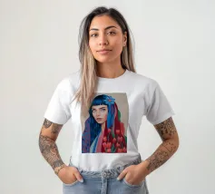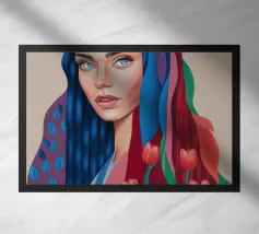 Uno splendido ritratto di donna i cui capelli sono una vibrante cascata di ciocche colorate, mescolate a tulipani rossi e bianchi. L'opera d'arte è una splendida e surreale fusione di bellezza umana e natura floreale.